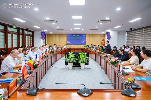 Tại đây, hai bên đã trao đổi và thảo luận về các dự án hợp tác tiêu biểu giữa ĐHCT và các đối tác châu Âu. Các đại biểu đã chia sẻ nhiều kinh nghiệm thực tiễn từ những dự án như: VLIR TEAM, ACCEES, qua đó cho thấy hiệu quả thiết thực của hợp tác trong nghiên cứu, đào tạo và chuyển giao công nghệ. Những kết quả này không chỉ góp phần nâng cao năng lực giảng dạy, nghiên cứu của Trường mà còn đóng góp tích cực cho sự phát triển bền vững của Đồng bằng sông Cửu Long (ĐBSCL). Kết thúc phiên thảo luận, GS.TS. Nguyễn Thanh Phương đã tổng hợp các ý kiến và nhấn mạnh ý nghĩa quan trọng của việc duy trì, mở rộng hợp tác với các đối tác Châu Âu. ĐHCT định hướng tiếp tục đẩy mạnh liên kết trong đào tạo, nghiên cứu khoa học và trao đổi học thuật, nhằm tạo dựng nền tảng bền vững cho phát triển nguồn nhân lực chất lượng cao và tăng cường hội nhập quốc tế trong giai đoạn tới.
